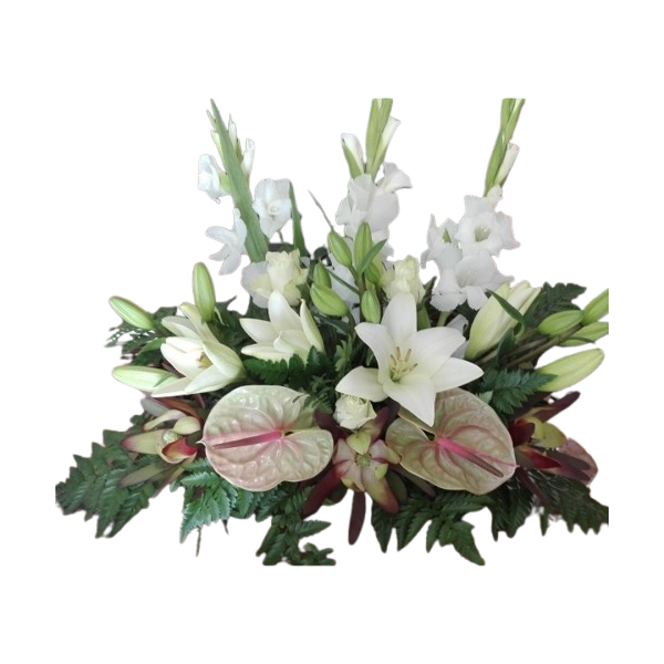 Arranjo preparado com 3 gladiolos , 2 anturios , 3 lilium, e 3 leucadendros
