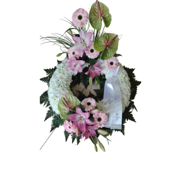 A coroa fúnebre em formato de coração composta por margaridas brancas e verdes é uma peça delicada e cheia de simbolismo, transmitindo sentimentos de pureza, serenidade e renovação. A base do coração é cuidadosamente estruturada, com margaridas brancas ...