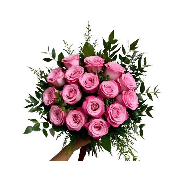 Um encantador buquê composto por deslumbrantes rosas cor de rosa, simbolizando amor, ternura e gratidão. O arranjo é harmoniosamente complementado por folhagens verdes exuberantes, como eucalipto, ruscus ou samambaia, adicionando frescor e sofisticação ao buquê.